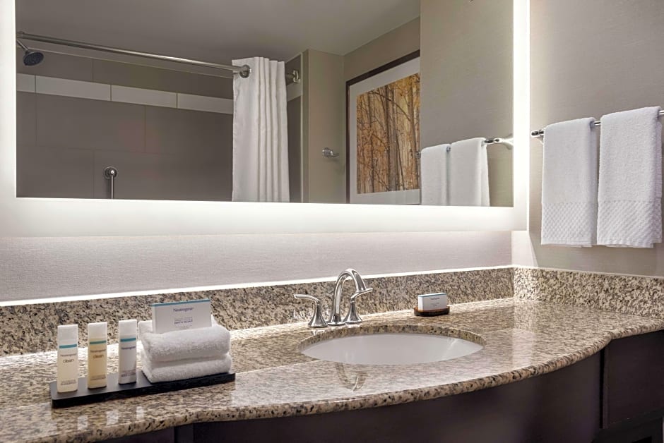 Refreshment Center, WiFi, Keurig coffee brewer, cooked-to-order breakfast, Evening Reception Refreshment center access, WiFi, Keurig coffee brewer are all included in our Premium Suites. Refreshment centers on these floors come stocked with non-alcoholic beverages, and snacks. All of our suites include complimentary cooked-to-order full breakfast and Evening Reception featuring beer, wine, premium spirits and light snacks. This two-room suite features a living room and a private bedroom with one king-sized bed. The furnishings include two 32-inch TVs, refrigerator, microwave, sofa bed, and armchair and activity table. The bathroom offers marble vanity, tub with shower and plush white towels.